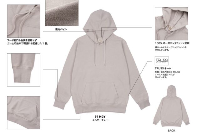 OGP-916 オーガニックコットンPOパーカー オーガニックコットン100%の裏パイル素材のパーカー。 100%オーガニックコットン使用 襟ネームにもオーガニックコットンを使用しています。 TRUSSネーム 左裾(後ろ内側)にTRUSSネーム・洗濯ネームが付いています。 フード紐口も金具を使用せず…