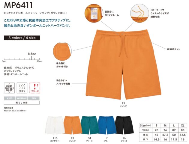 MP6411 8.5オンスダンボールニットハーフパンツ(ポリジン加工) こだわりの丈感と抗菌防臭かこうでアクティブに履き心地のよいダンボールニットハーフパンツ こだわりの丈感と履き心地の良い8.5オンスダンボールニットハーフパンツです。 ダンボールニット素材の独特の肌触りと高い耐久性で、日々の快適な…