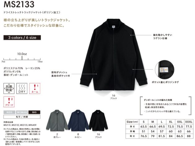 MS2133ドライストレッチトラックジャケット(ポリジン加工) 襟の立ち上がりが美しいトラックジャケット こだわりの仕様でスタイリッシュな印象に 肌触りが柔らかく、長時間の着用もストレスフリー。 優れたPOLYGIENE技術を採用し、抗菌・防臭機能で清潔感を保ちます。 ●素材:ダンボールニット 10…