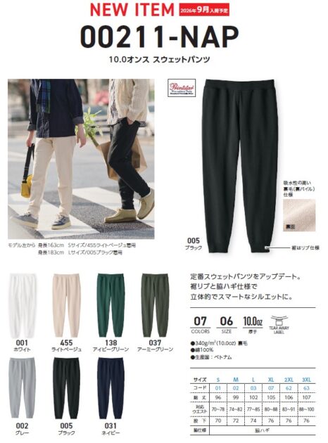 予約入荷予定 2026年9月入荷予定 00211-NAP 10.0オンス スウェットパンツ 定番スウェットパンツをアップデート。裾リブと脇ハギ仕様で立体的でスマートなシルエットに。 吸水性の高い裏毛(裏パイル)仕様