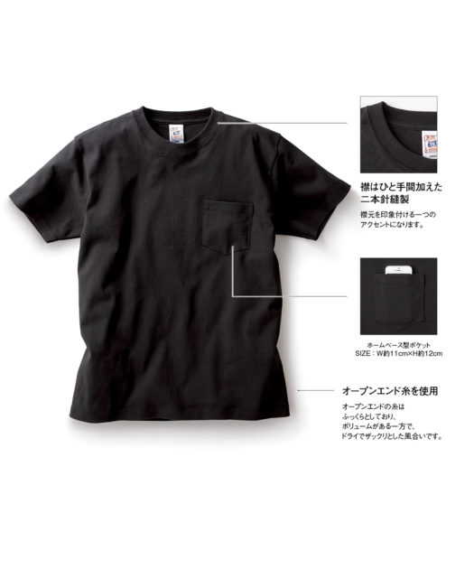 OE1117 オープンエンド マックスウェイト ポケットTシャツ オープンエンドに胸ポケットのさり気ないディテールをプラス。 襟はひと手間加えた二本針縫製 襟元を印象付ける一つのアクセントになります。 オープンエンド糸を使用 オープンエンドの糸はふっくらとしており、ボリュームがある一方で、ドライでザ…