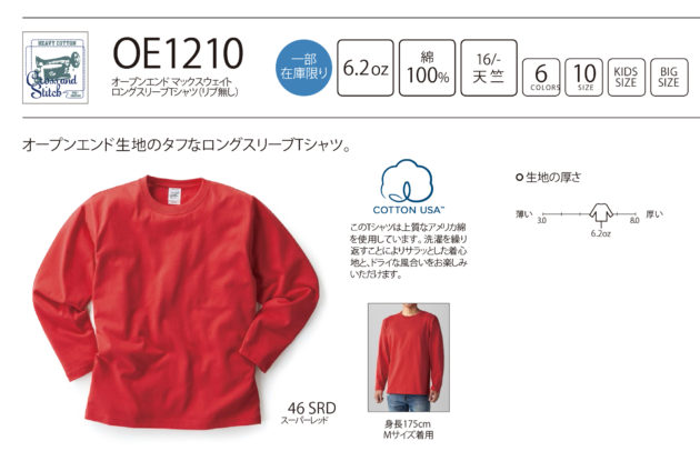 OE1210 オープンエンド マックスウェイトロングスリーブTシャツ(リブ無し オープンエンド生地のタフなロングスリーブTシャツ。 このTシャツは上質なアメリカ綿を使用しています。 洗濯を繰り返すことによりサラッとした着心地と、ドライな風合いをお楽しみいただけます。 ※01 ホワイト・09 ブラック…