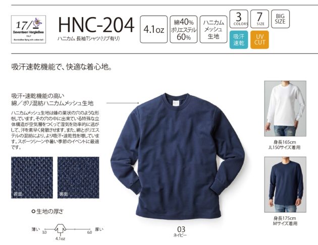 HNC-204 ハニカム 長袖Tシャツ(リブ有り)