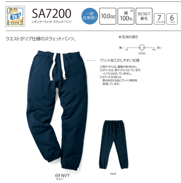 ウエストがリブ仕様のスウェットパンツ。 プリント加工がしやすい仕様 ◎両サイドには、縫製がありません。 ◎ポケットは、両サイドに付いています。バックには付いていません。 ◎ポケット生地には、厚みを抑える為にTシャツ素材を使用しています。 ※一部カラー在庫限り。 43エンジ