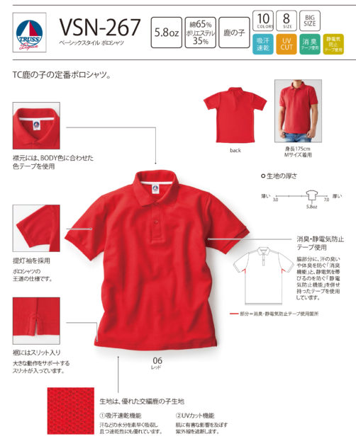 TC鹿の子の定番ポロシャツ。 襟元には、BODY色に合わせた色テープを使用 提灯袖を採用 ポロシャツの王道の仕様です。 裾にはスリット入り 大きな動作をサポートするスリットが入っています。 消臭・静電気防止テープ使用 脇部分に、汗の臭いや体臭を防ぐ「消臭機能」と、静電気を帯びるのを防ぐ「静電気防止機…