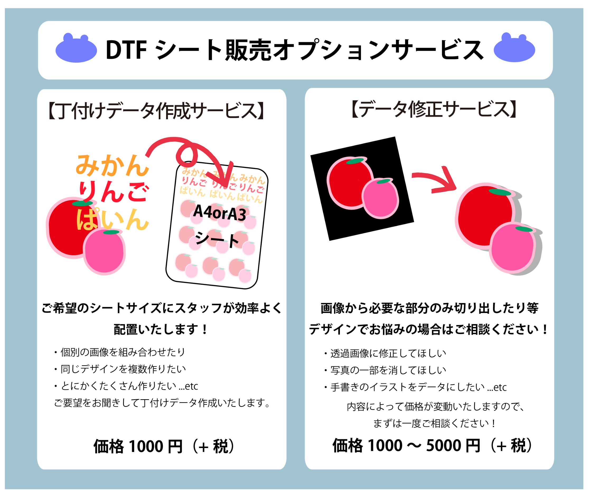 - デザイン修正サービス: 「背景を消したい」「色味を変えたい」といった微調整もお任せください(内容によって変動:1000〜5000円)。