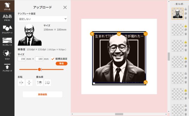 選択したデザインテンプレートは、イラスト・文字の色、文字のテキストの簡単な配置や変形が編集可能です。あなたの作ってみたいデザインを形にしてみてください。