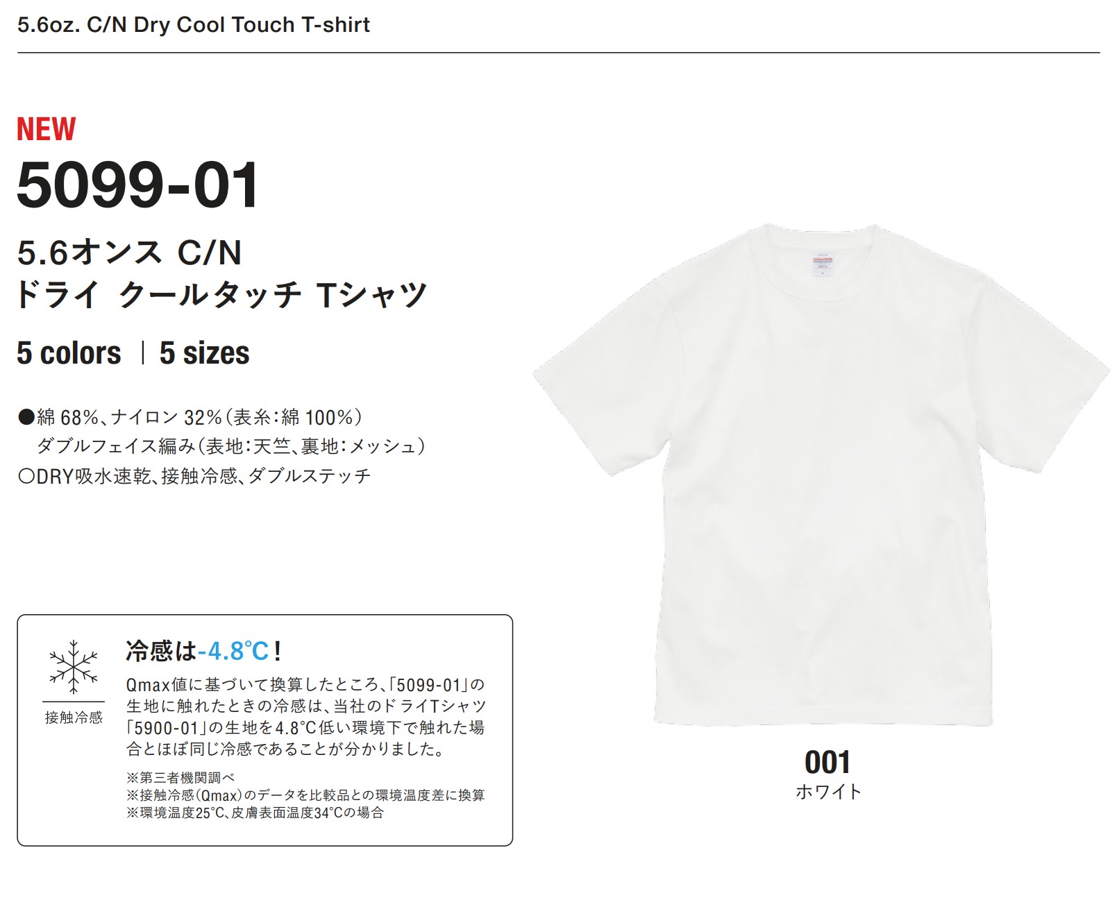 冷感は-4.8℃!Qmax値に基づいて換算したところ、「5099-01」の生地に触れたときの冷感は、当社のドライTシャツ「5900-01」の生地を4.8℃低い環境下で触れた場合とほぼ同じ冷感であることが分かりました。※第三者機関調べ※接触冷感(Qmax)のデータを比較品との環境温度差に換算※環境温度25℃、皮膚表面温度34℃の場合