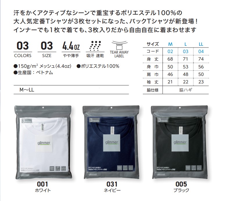 汗をかくアクティブなシーンで重宝するポリエステル100%の大人気定番Tシャツが3枚セットになった、パックTシャツが新登場!