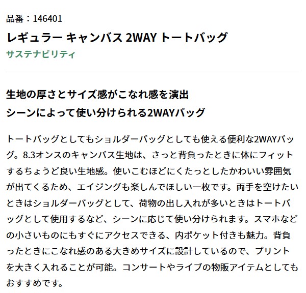トートバッグとしてもショルダーバッグとしても使える便利な2WAYバッグ。8.3オンスのキャンバス生地は、さっと背負ったときに体にフィットするちょうど良い生地感。使いこむほどにくたっとしたかわいい雰囲気が出てくるため、エイジングも楽しんでほしい一枚です。両手を空けたいときはショルダーバッグとして、荷物の出し入れが多いときはトートバッグとして使用するなど、シーンに応じて使い分けられます。スマホなどの小さいものにもすぐにアクセスできる、内ポケット付きも魅力。背負ったときにこなれ感のある大きめサイズに設計しているので、プリントを大きく入れることが可能。コンサートやライブの物販アイテムとしてもおすすめです。