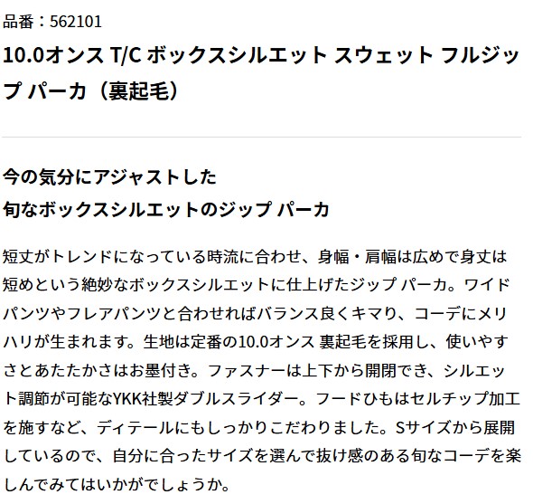 5621-01 10.0オンス T/C ボックスシルエット スウェット フルジップ パーカ(裏起毛)