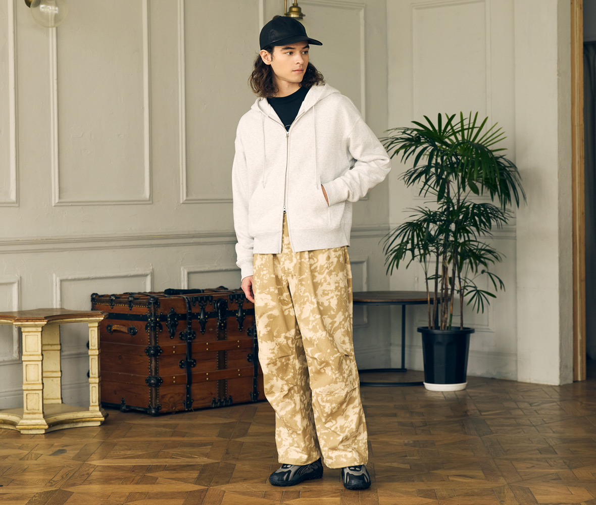 短丈がトレンドになっている時流に合わせ、身幅・肩幅は広めで身丈は短めという絶妙なボックスシルエットに仕上げたジップ パーカ。ワイドパンツやフレアパンツと合わせればバランス良くキマり、コーデにメリハリが生まれます。生地は定番の10.0オンス 裏起毛を採用し、使いやすさとあたたかさはお墨付き。ファスナーは上下から開閉でき、シルエット調節が可能なYKK社製ダブルスライダー。フードひもはセルチップ加工を施すなど、ディテールにもしっかりこだわりました。Sサイズから展開しているので、自分に合ったサイズを選んで抜け感のある旬なコーデを楽しんでみてはいかがでしょうか。