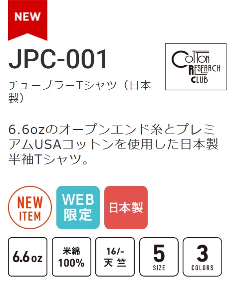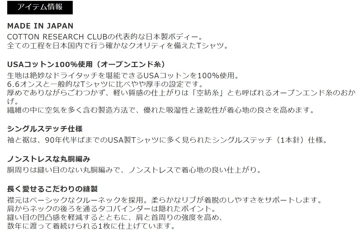 COTTON RESEARCH CLUB JPC-001 チューブラーTシャツ(日本製)