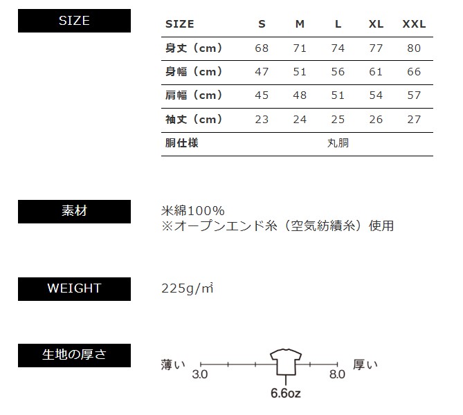 - 米綿100% ※オープンエンド糸(空気紡績糸)使用 WEIGHT 225g/㎡