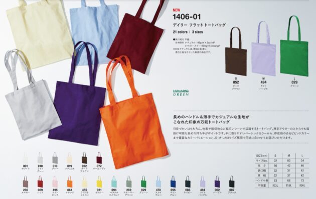 日常づかいはもちろん、物販や販促物など幅広いシーンで活躍するトートバッグ。厚手アウターの上からでも肩掛け可能な長めの持ち手がポイントです。手に取りやすいベーシックカラーから、存在感のあるビビッドカラーまで豊富なカラーバリエーション。S・M・Lの3サイズ展開で用途に合わせてお選びいただけます。